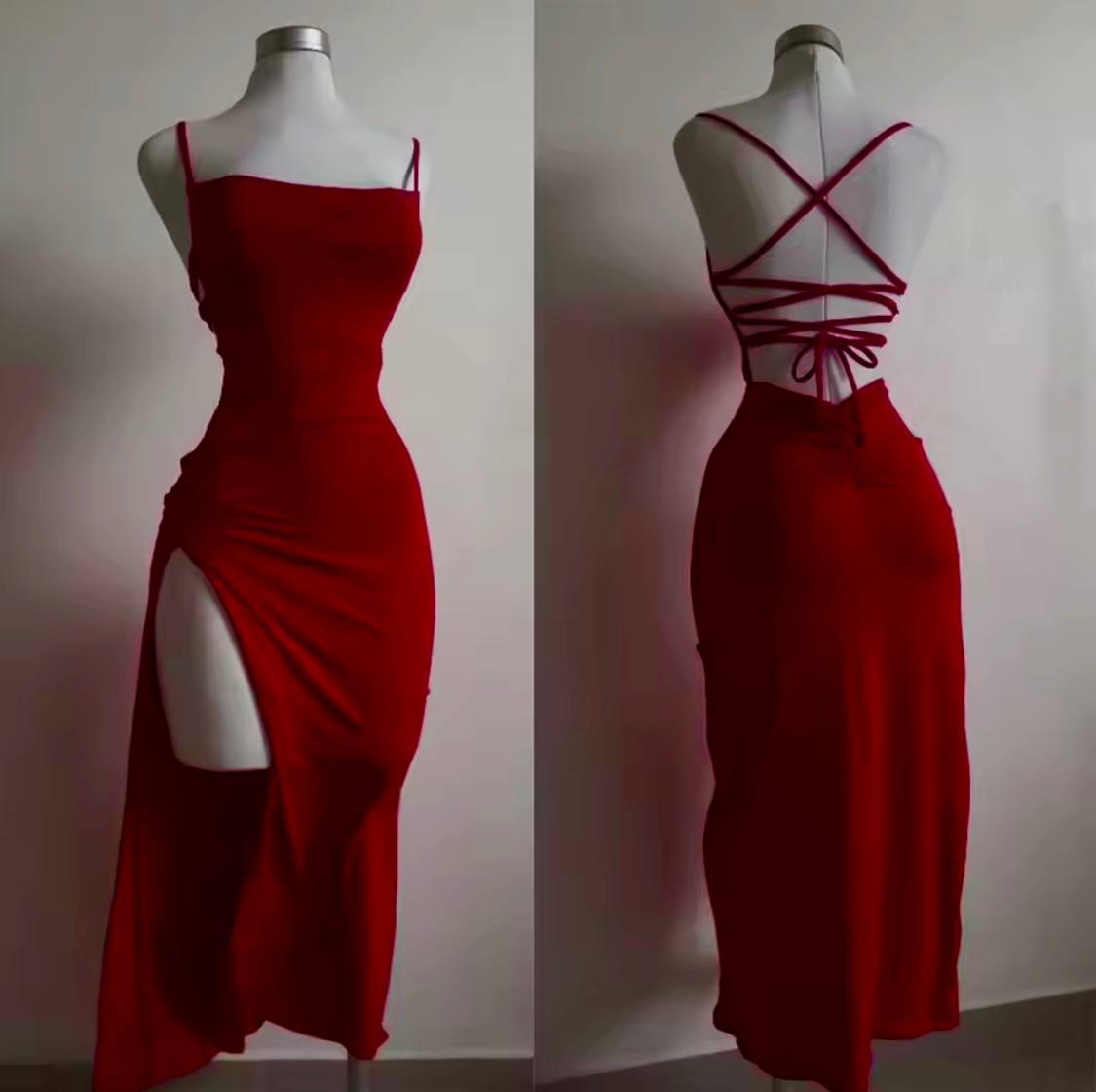 • Design: Halter neck, backless, body-hugging fit, and high side slit