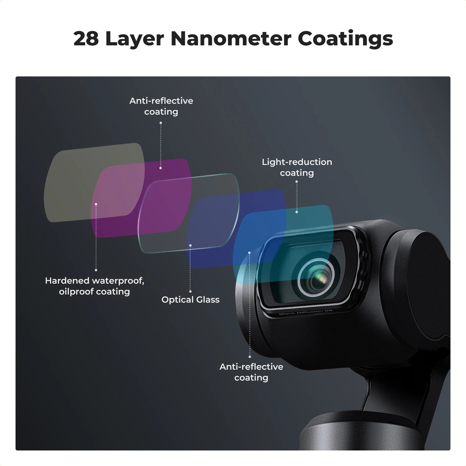 Crystal Clear Footage and Secure Fit - Imported Glass for Superior Performance - Nanometer Coatings for Waterproof and Scratch-Resistant Protection - High Transmittance for Optimal Image Quality - Ultra-Thin Frame Design to Prevent Vignetting - Compatible with DJI Osmo Pocket 3.
